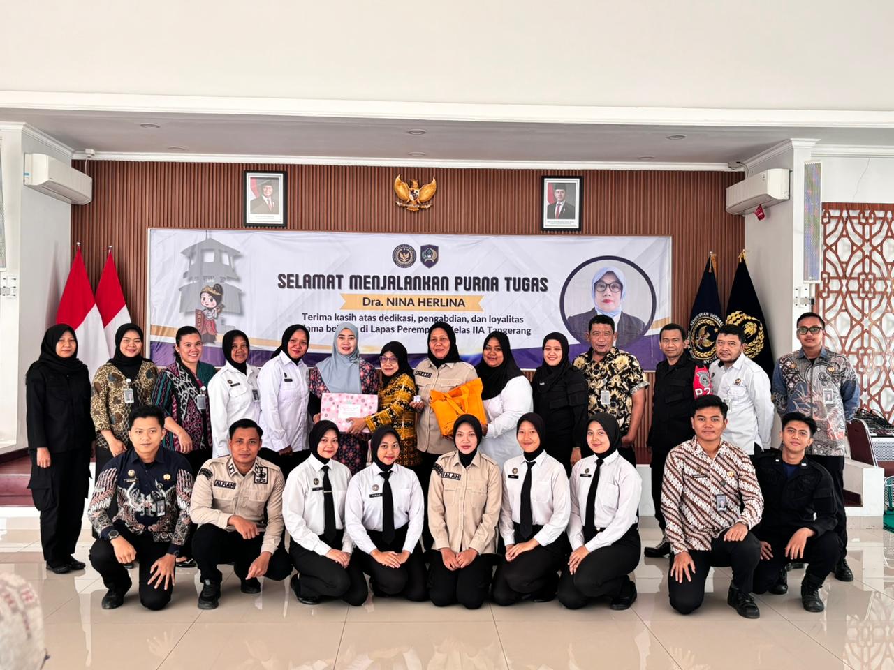 Acara diakhiri dengan penyerahan cendera mata dan foto bersama seluruh jajaran sebagai bentuk penghormatan serta kenangan indah atas perjalanan panjang Ibu Dra. Nina Herlina selama bertugas di Lapas Perempuan Kelas IIA Tangerang.