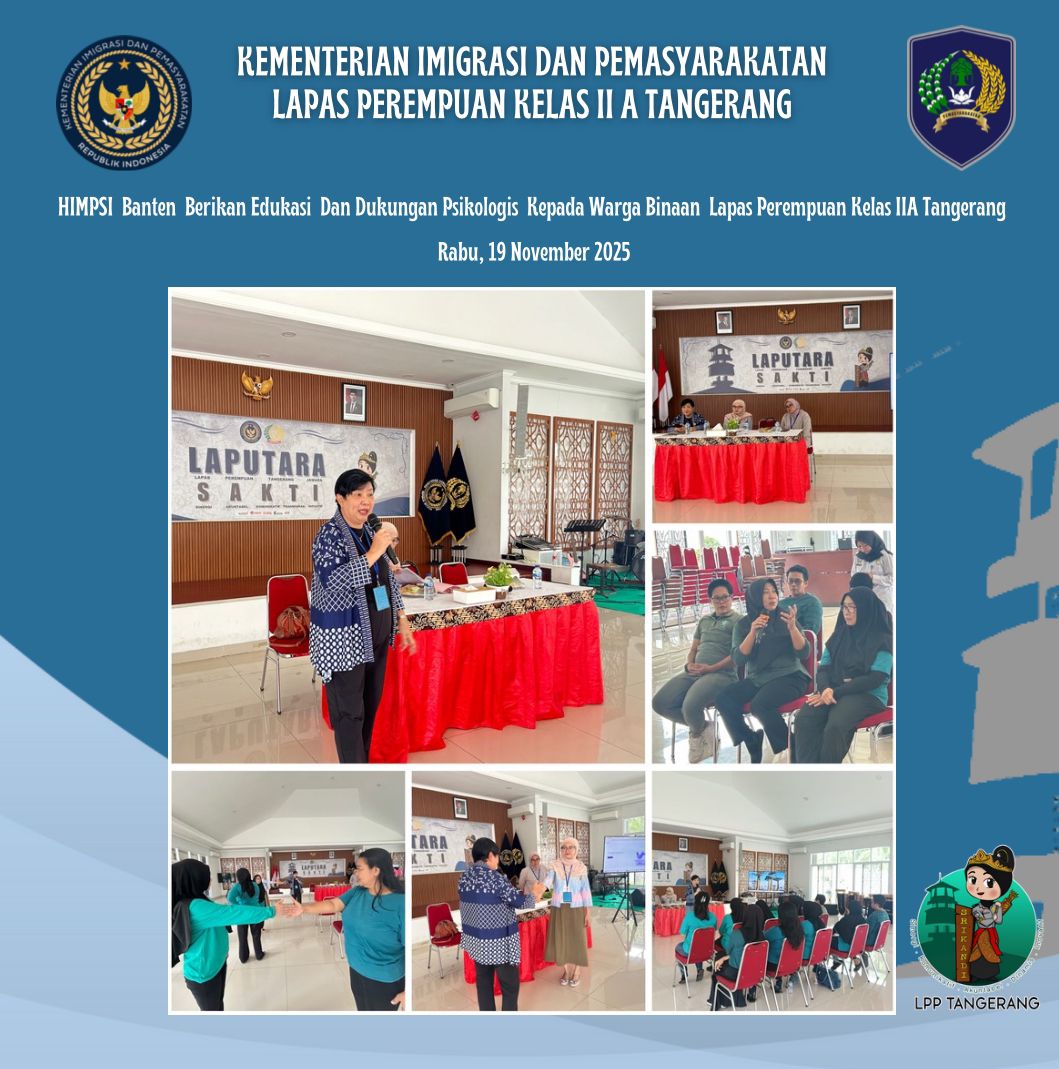 Lapas Perempuan Kelas IIA Tangerang kembali menjadi tempat kegiatan edukatif yang inspiratif melalui pelaksanaan *Psikoedukasi oleh Himpunan Psikologi Indonesia (HIMPSI) Banten* dengan tema *“Stress Management dan Trauma Healing”*. Kegiatan ini dihadiri oleh Ketua HIMPSI Banten *July Tikilie,S.Psi.,Psikolog* beserta jajaran pengurus dan Kasubsi Bimkemaswat. Kegiatan ini diikuti oleh *10 orang warga binaan pemasyarakatan (WBP)* yang antusias mengikuti setiap sesi pembelajaran.